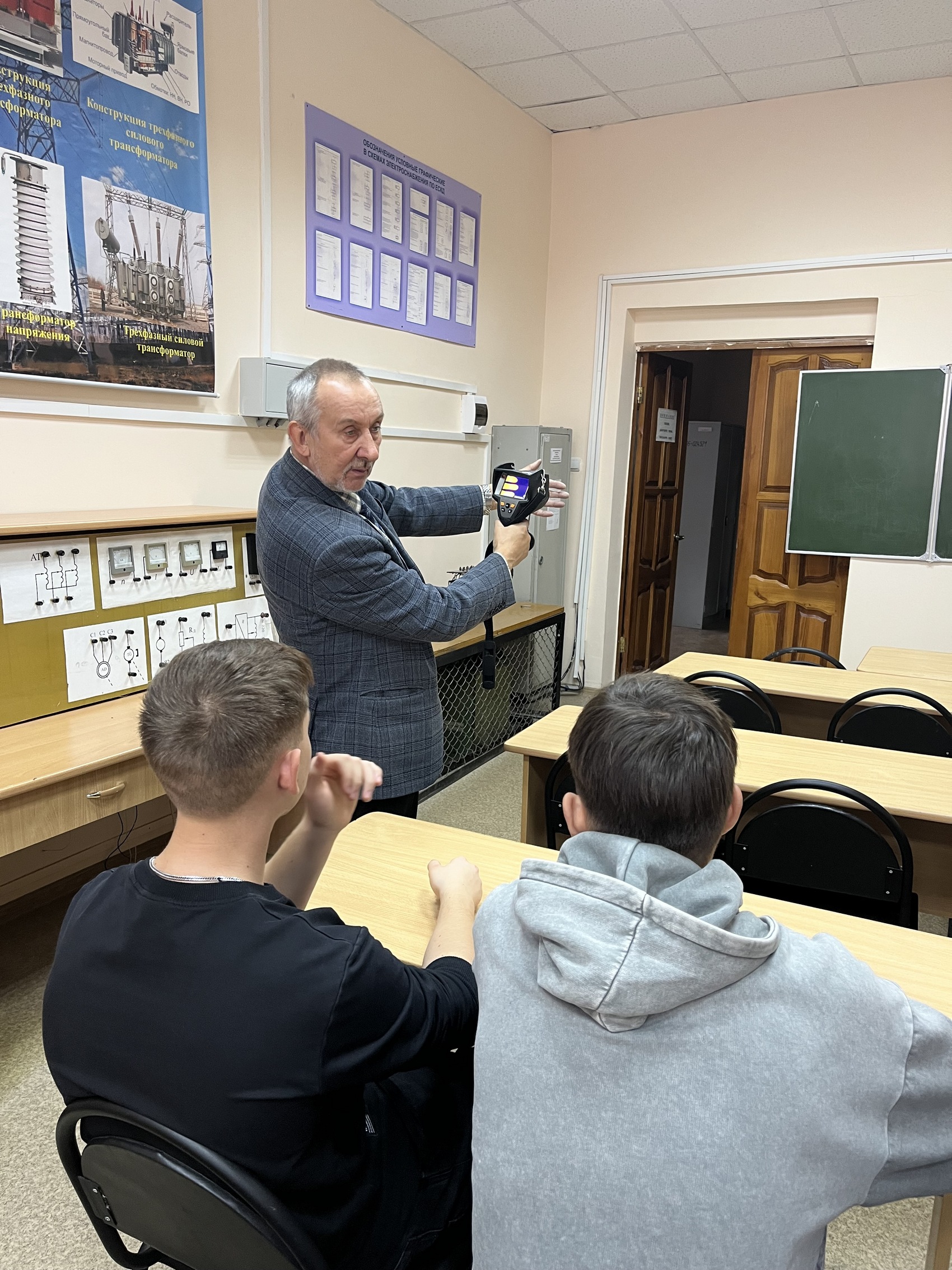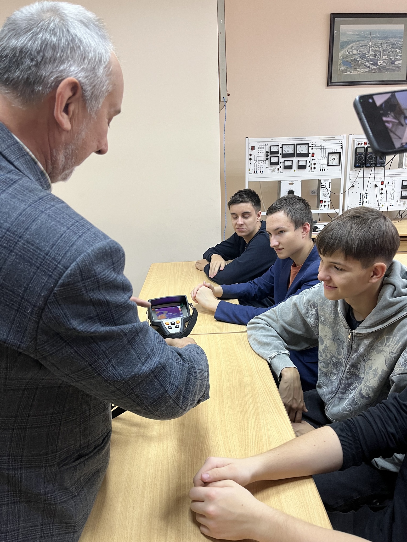Занятие с ребятами провел к.т.н., доцент Голобоков Сергей Владимирович, который рассказал им о спектрах излучения, о методах диагностики силового оборудования, о бесконтактных методах определения температуры объектов. Школьникам наглядно продемонстрировали, как с помощью тепловизора можно определить температуру объектов, как подобные устройства используют для определения мест перегрева оборудования, а также места потерь тепловой энергии.
